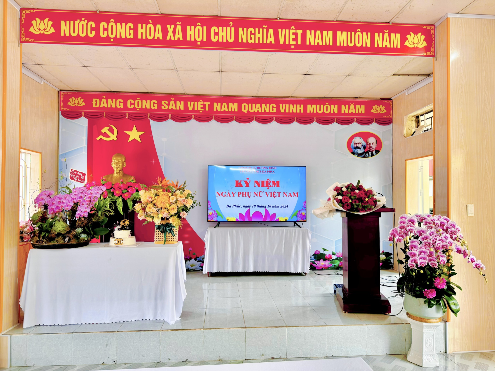 Sáng ngày 19/10/2024, trong không khí nồng nàn của hương hoa sữa, của những cơn gió se se lạnh, của những ánh nắng vàng rực rỡ, công đoàn trường THCS Đa Phúc đã long trọng tổ chức lễ kỉ niệm 94 năm ngày phụ nữ Việt Nam cho toàn thể nữ cán bộ giáo viên nhà trường. Buổi lễ kỉ niệm tổ chức thành công, mang đến không khí phấn khởi, vui tươi cho các chị em; tăng cường tình đoàn kết gắn bó, khích lệ động viên tinh thần nữ công nhân, viên chức, người lao động hăng hái thi đua, phấn đấu lập thành tích hoàn thành thắng lợi các nhiệm vụ kế hoạch năm học 2024 – 2025.