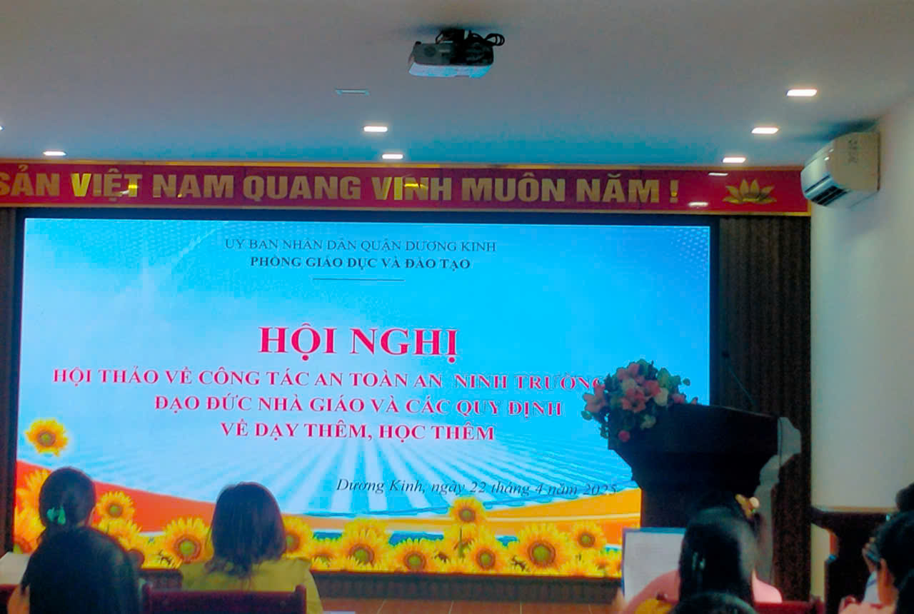 Ngày 22/4/2025, PGD&ĐT quận Dương Kinh đã tổ chức Hội nghị Hội thảo với cán bộ quản lý, giáo viên các nhà trường trong quận. Hội nghị tổ chức với mục đích nâng cao nhận thức của cán bộ quản lý, giáo viên các nhà trường về công tác an toàn an ninh, phòng chống tệ nạn xã hội trong trường học, vấn đề đạo đức nhà giáo và các quy định về dạy thêm, học thêm.