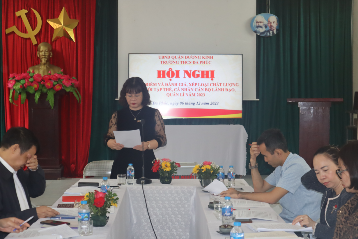 Thực hiện công văn số 94-KH/QU ngày 27 tháng 11 năm 2023 của Quận ủy Dương Kinh Sáng thứ tư, ngày 06 tháng 12 năm 2023 Chi bộ Trường THCS Đa Phúc tổ chức Hội nghị kiểm điểm và đánh giá xêp loại chất lượng tổ chức Đảng, đảng viên năm 2023 về việc tổ chức kiểm điểm và đánh giá xêp loại chất lượng tổ chức Đảng, đảng viên năm 2023. Sự chỉ đạo của Ban tổ chức Quận ủy. Sáng thứ tư, ngày 06 tháng 12 năm 2023 Trường THCS Đa Phúc tổ chức Hội nghị kiểm điểm và đánh giá xếp loại chất lượng đối với tập thể, cá nhân cán bộ lãnh đạo quản lí năm 2023.