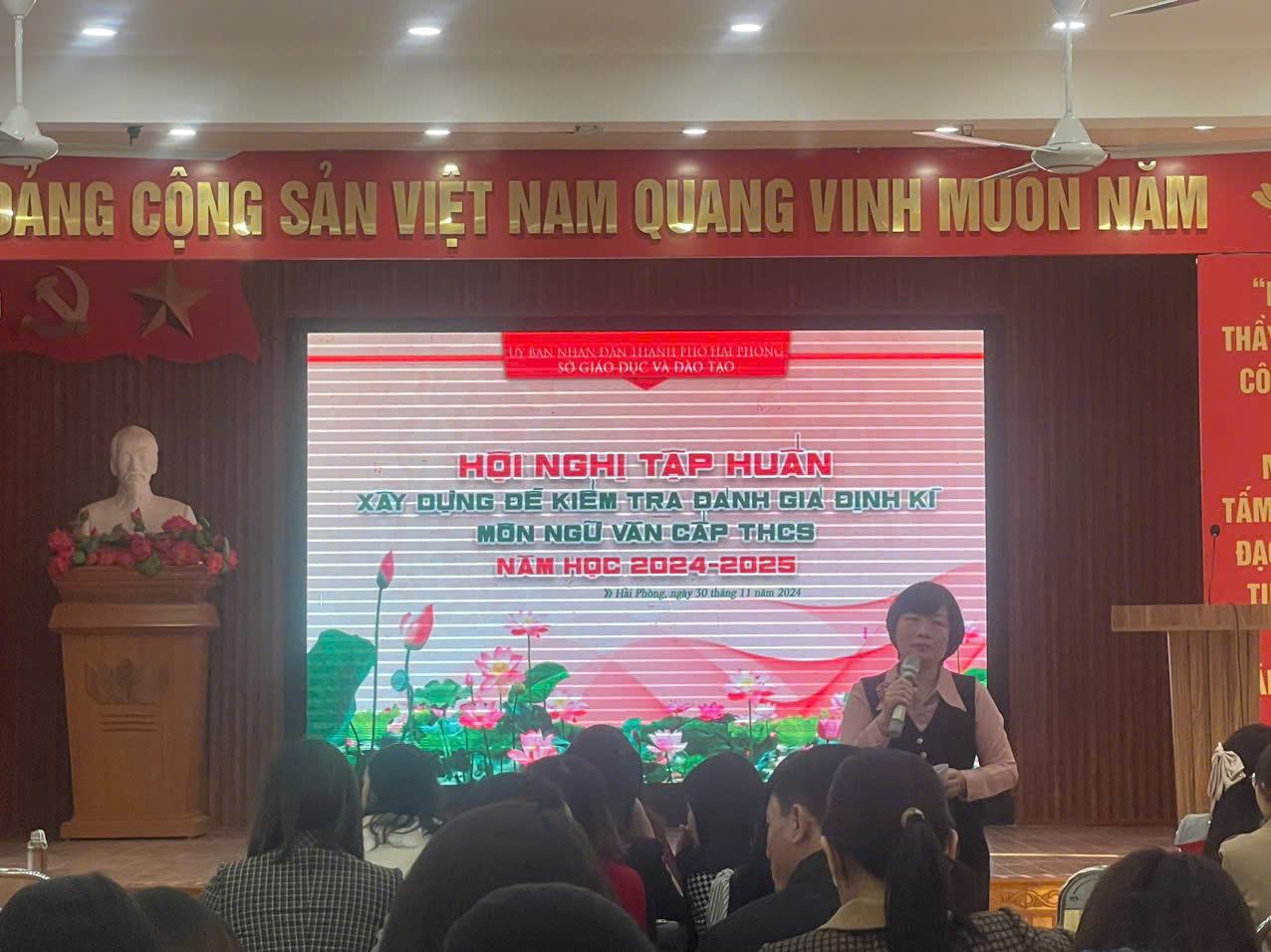 Sáng 30/11, theo công văn triệu tập tham dự Hội thảo tập huấn xây dựng đề kiểm tra đánh giá định kỳ môn Ngữ văn của Phòng GD, 10 cán bộ, giáo viên cốt cán môn Ngữ văn đại diện cho 6 trường THCS trong quận Dương Kinh đã tham dự Hội thảo tại trường THPT Thái Phiên